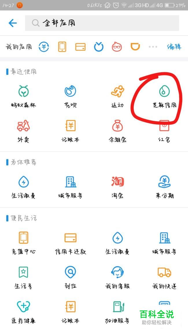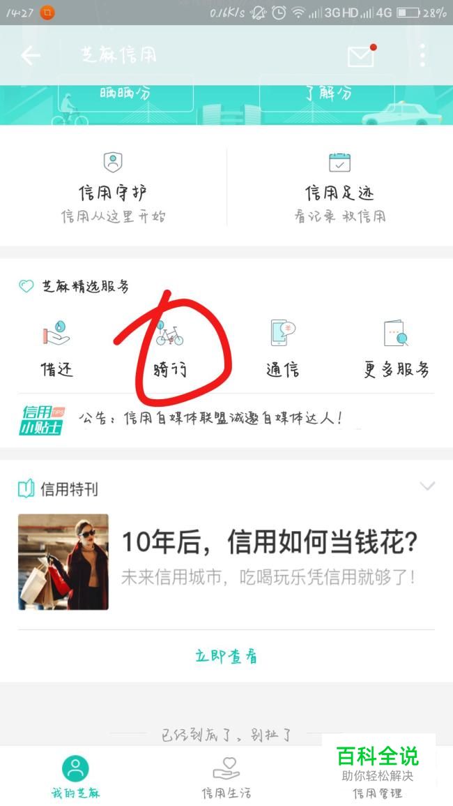 打开支付宝,找到芝麻信用点击进入,然后在芝麻信用中找到骑行。