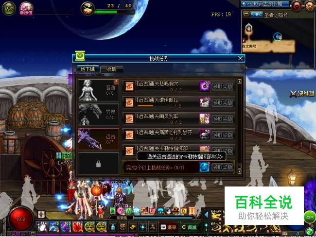 在玩家疲劳值的上面有一排选项,挨个的寻找,就可以找到挑战任务,找到以后点击进入,在地下城这个选项里一直往下翻,就可以找到远古地下城的挑战任务,最下面就是领取镇魂石的地方。