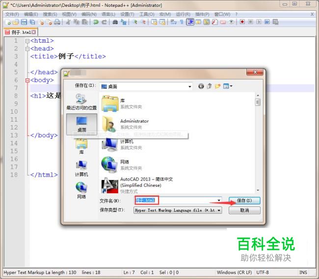 然后我们就来编写一个简单的能在浏览器上打开的文本。首先我们在notepad++里输入<html><head><title>例子</title></head><body></body></html>标签。如图所示: