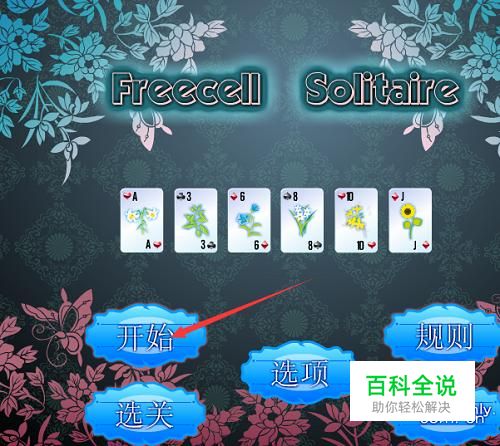 进入到空当接龙的游戏页面,点击游戏开始,游戏区由四个回收单元,四个可用单元和一副牌组成。