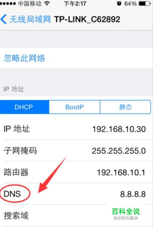 还有一种情况比较复杂 dns服务器出问题了,我们可以通过指定dns服务器ip地址来解决,打开苹果手机无线网络,点击"i"符号进入里面进行修改,把里面的DNS的IP地址修改为8.8.8.8或者114.114.114.114解决。