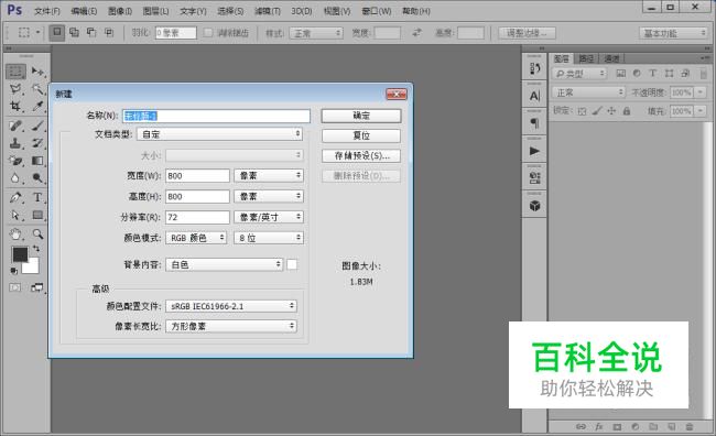 打开ps软件之后,我们新建一个画布(选择文件-新建或者是快捷键Ctrl+N都是可以的),小编就新建了一个800*800的画布给大家做示范。