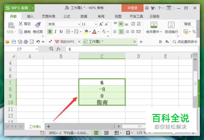 进入表格主界面后,在单元格中输入“6 -8 0 指南”为例说明,我们的目的就是通过中括号工具给这些数进行颜色的分类。首先鼠标左键框选出这些单元格区域,如图所示: