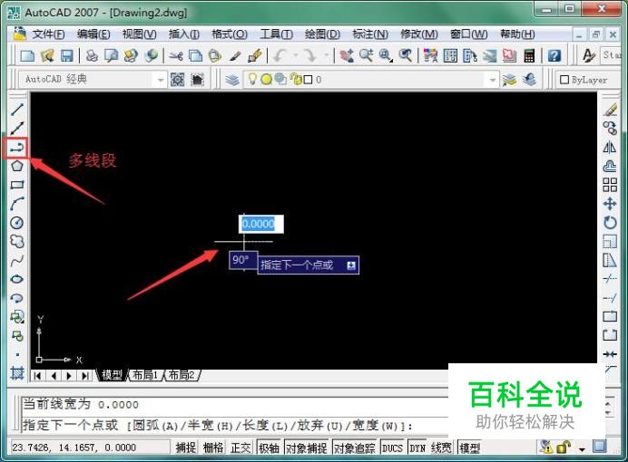 进入操作界面后,首先在绘图工具栏中选择“多段线”工具,执行多段线命令。系统提示指定起点,根据实际需要找到适当位置,如图所示: