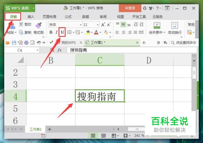 进入操作界面后,首先,在单元格中输入一小段文字为例。在界面上方“开始”中找到“添加下划线”图标,如图所示: