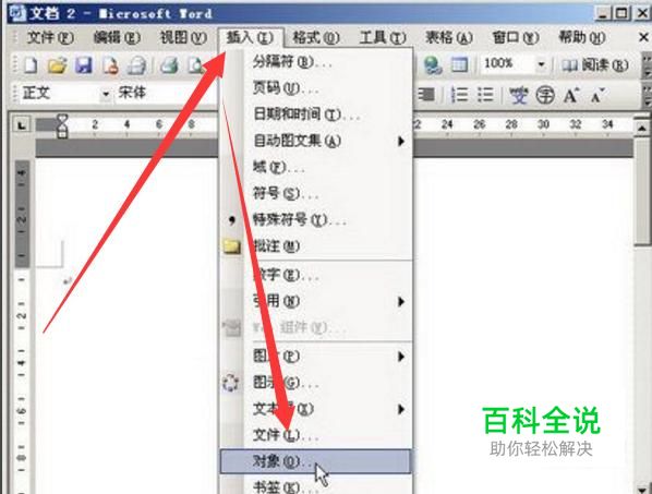 打开Word2003,然后如下图示,点击插入→对象。