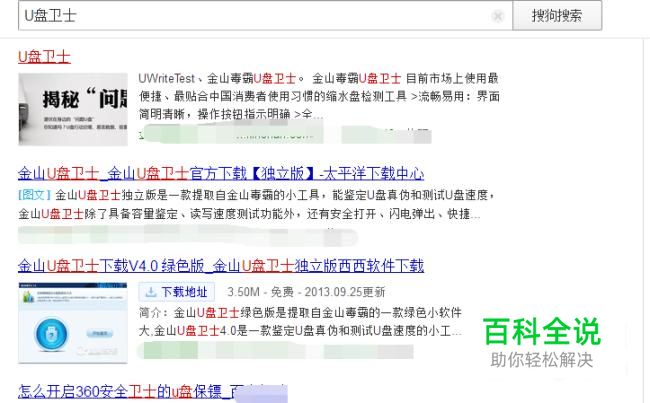首先打开搜狗浏览器。在搜索页输入:U盘卫士。然后点击官网下载软件。顺便把U盘插到电脑USB接口。