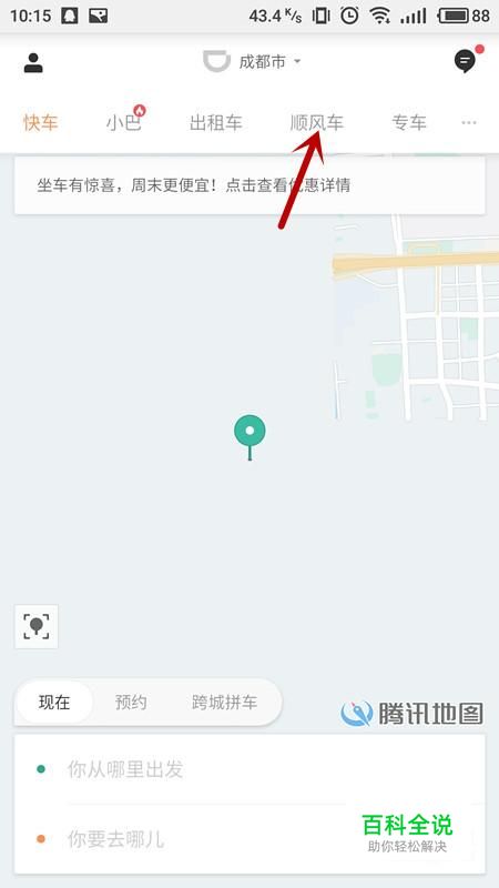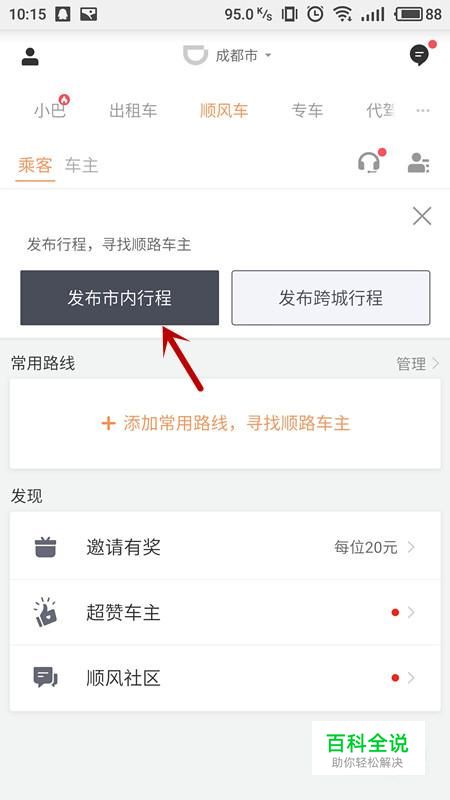 进入顺风车界面,根据需求选择市内或者跨城,举例点击“发布市内行程”