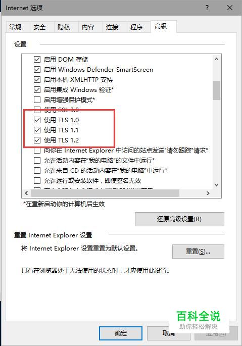 再Internet选项中点击高级,进入高级设置界面。将如图所示的选择选上,然后点击应用、确定再重启计算机。