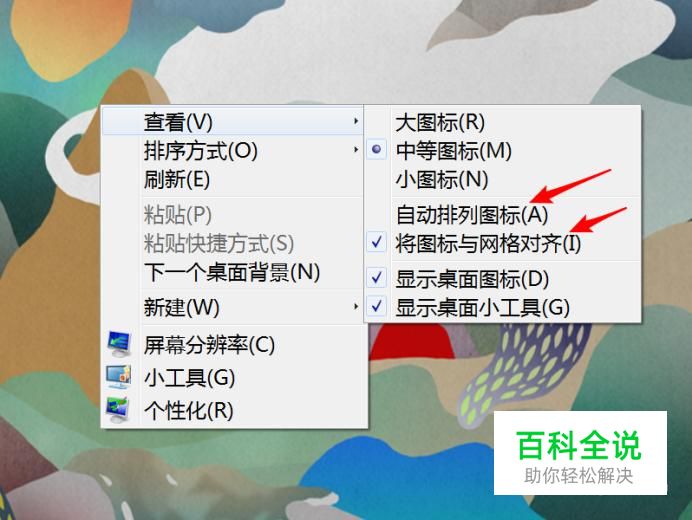 在查看的子菜单上,把‘自动排列图标’和‘将图标与网格对齐’这二个前面的勾去掉,这样就可以任意拖动图标了。