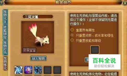宠物炼化: 宠物为宝宝或者变异宝宝时才可进行炼化;宝宝可进行重置所有属性炼化和重置资质、成长率、悟性炼化;变异宝宝可进行重置所有属性炼化,重置资质、成长率、悟性炼化,重置技能和等级炼化,如下图。 宠物炼化面板 让野生宠物变成宝宝,需要道具还婴仙露,按照上图的操作步骤即可将野生宠物变成宝宝了。 让宝宝宠物变成变异宝宝,需使用道具生死劫轮,进入宠物炼化面板进行炼化,或者直接在宝宝的头像区域里的我要变异按钮操作,如果你运气极差的话,在使用第15个时必定变异。对变异宝宝的各项资质、成长率、悟性以及技能进行炼化洗髓时,需使用道具涅槃仙丹。 变异宝宝炼化技巧:了解宠物基础信息后你一定会发现宠物的成长率很重要,且区别于其它资质,成长率是不能单独重置的,所以在使用涅槃仙丹炼化资质、成长率和悟性时,可以暂时忽略资质和悟性,以成长率为优先炼化点,为什么呢?因为每次使用涅槃仙丹炼化时,成长率是必定提升的,最少1点,最多就看运气了,有几十点甚至上百点的提升!直到将成长率提升到你满意的状态后,再去关注资质,并且使用妖元提升资质。