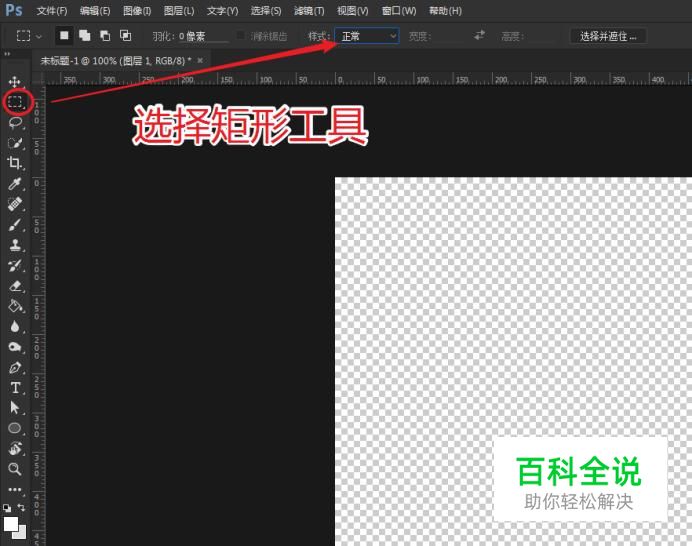 通过长按鼠标左键,选择子级菜单下的“矩形工具”。 将样式设为:正常