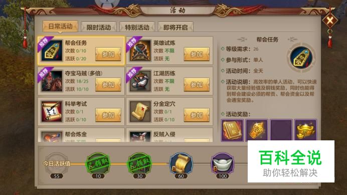 进入活动界面,点击“帮会任务”进行查看,参加等级为26,每日可完成10次,完成后可获得20点活跃。