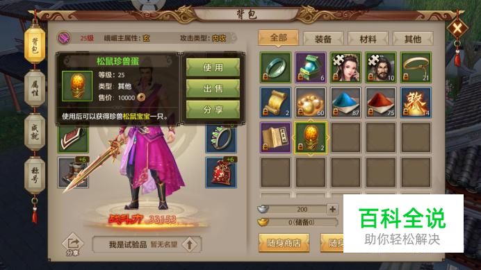 获得珍兽宝宝后需要先进行使用才能获得,在游戏主界面选择“背包”