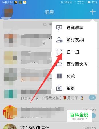 看到主页面右上角的+了吗?点击一下。选择扫一扫。