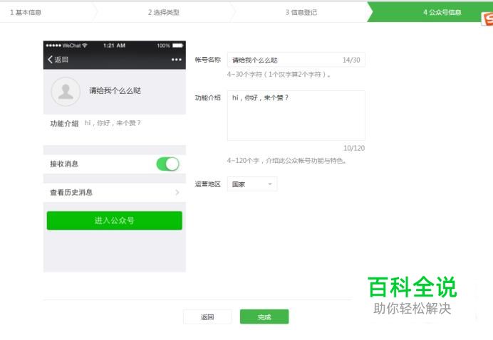 最后一步是输入你的微信公众号的名称以及介绍,注意需要先提前确认你想取的名字是否被别人用了,如果不幸被人用了,那么就只能换一个了。