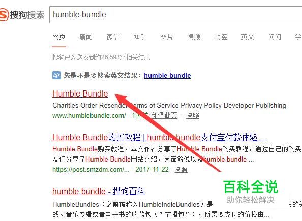 首先我们打开搜狗搜索,然后输入“humble bundle”关键词,接着进入HB官方网站(如图所示)。