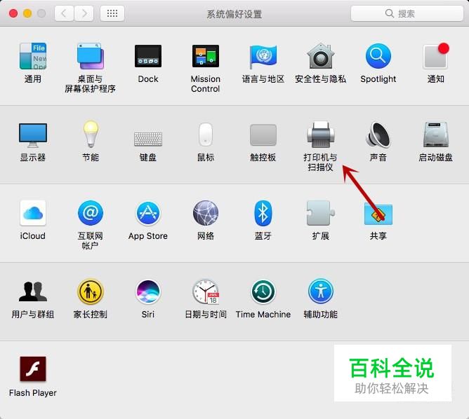 进入电脑系统偏好设置界面,点击“打印机与扫描仪”