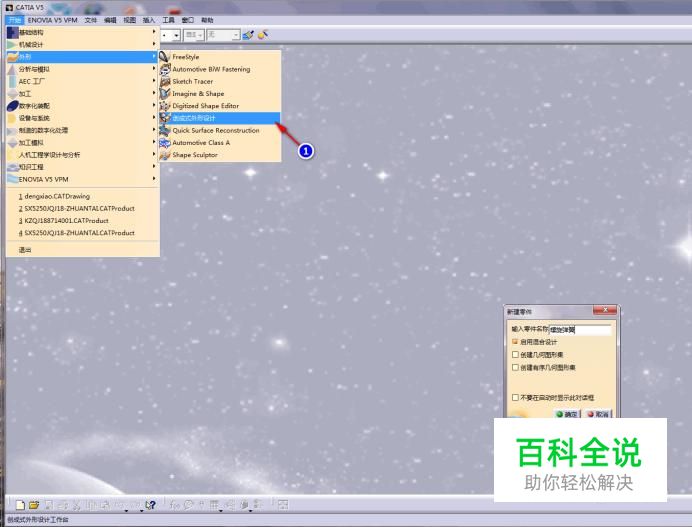 首先我们打开CATIA,在菜单栏单击开始>外形>创成式曲面设计,弹出新建零件对话框,在输入零件名称一栏我们将名称设定为螺旋弹簧,并勾选启用混合设计,单击确定退出命令对话框;