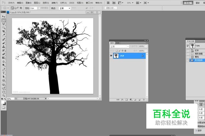 首先找一张树的素材,最好是树的剪影,然后新建图层,填充一个背景色。同时要把树剪影的图层,单独剪切出来。变成两个图层。