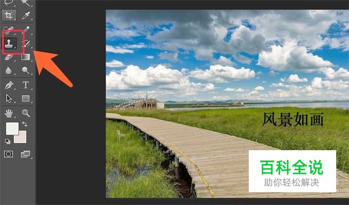 我们先点击选中左边工具栏上的‘图章工具’,