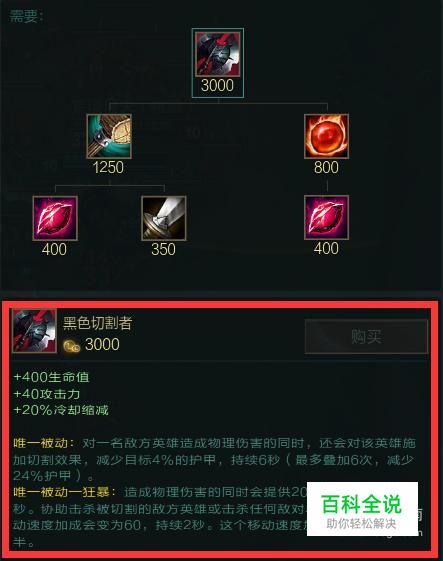 第三件装备选择的是黑切,因为黑切可以增加生命值,攻击力,冷却缩减,对敌方造成伤害时,可以使对方的护甲减少,使自己伤害增加,而且在造成伤害的同时能够提升移速。