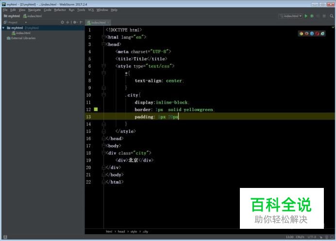 网页中制作与链接CSS的方法 内联样式:在头部<head>标签里嵌入<style type="text/css"></style>,列:在网页主体内添加一个<div>标签,类名为“city”,在添一个<div>标签,内容为“北京”,通过内联样式CSS,为文字添加边框(border)宽度1px,实心线:(solid)颜色为黄色(yellowgreen),内边距:文字与边框的边距(padding为上下5px,左右20px)代码如下图: