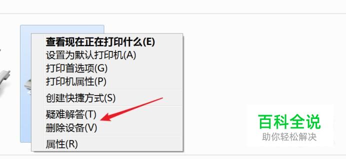 打开后,右键点击出问题的打印机,选择‘删除设备’