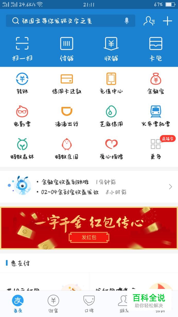 打开支付宝,在搜索界面输入“天天领红包”,就可以去领取一个红包了,不过红包的大小是随机的哦,可能是几十块,也可能是几角钱,都是说不定的。