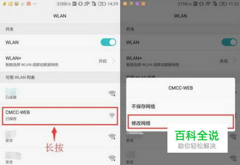 点击连接上可以使用的WiFi,在其WiFi名称上长按几秒便会弹出一个选项框,选择修改网络。