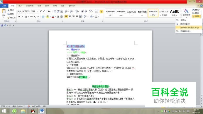首先,将所有一级目录选中。如果文本内容的多级目录是加以区分了的,则可以选择第一个,然后找到”开始选项卡“中,右上角“选择”,打开下拉列表,点击“选择格式相似的文本”,如果没有区分的话,就只能单个选了哦~