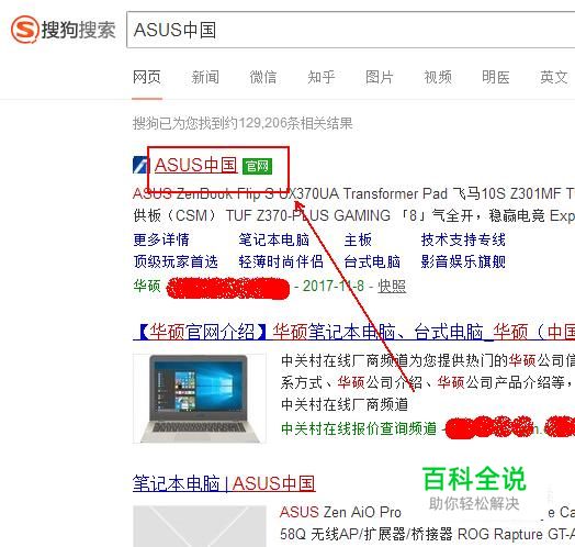 在搜狗搜索结果中找到ASUS中国官网并点击进入。