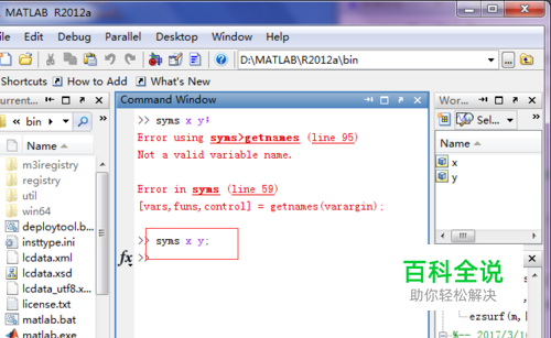 建立两个符号变量,如图所示; 代码如下:syms x y;