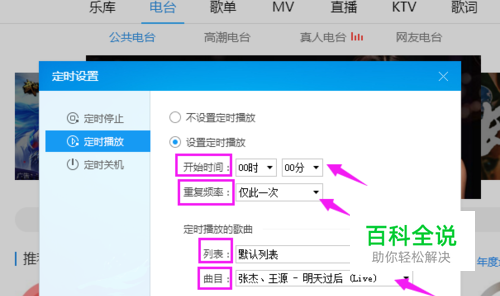 选择开始时间,重复频率,播放歌曲后,点击【确定】。然后关闭这个页面就可以了。之后只要时间一到,就会自动播放音乐。