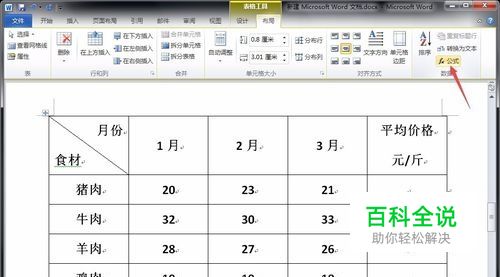如下一组数据,首先需要求出每个月的平均价格,也就是每行的平均数。这时要将光标移动到第一行最后一列的单元格中,然后点击“布局”菜单下的“公式”选项。