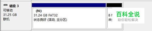 先教大家辨别一下扩容卡,扩容卡有个很大的特点,你从电脑的磁盘管理看会发现大概有8M左右的空间是未分区的,不能使用的,如图。(估计就是用来藏改容量数据的)。还有一点32g的扩容卡一般都显示实际容量为31.2G,但是买的正规的卡一般只有29点几G的实际容量。
