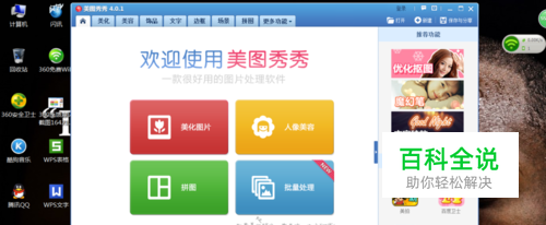 首先你要下载个软件——电脑版的美图秀秀。因为在众多图画处理的软件里面,美图秀秀的内存是比较小的,占不了多少内存。而且这样的软件普及率也挺高的。如图所示: