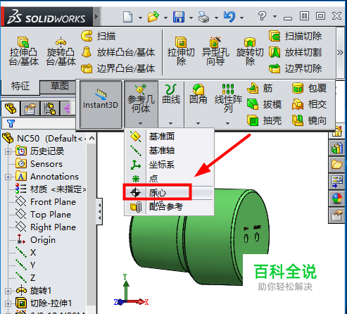 在特征一栏,参考几何题,选择质心按钮,如图
