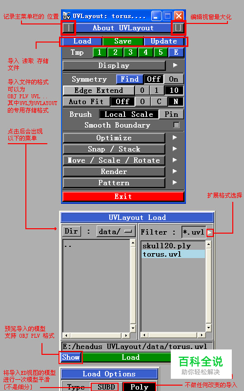 第二节 主菜单功能 1 记录 / 存储 / 读取的相关选项 About UVlayout 大按钮 Map 按钮 用于显示 在3D 视图中 按下T键所显示的贴图 后面是贴图路径 Trance Max Rez 这个数值用于控制 UV 视图中 贴图的最大尺寸 Mouse Buttons 使用的是几键鼠标,一般都是3键鼠标 Double Tap 键盘双击时的延迟反映时间 Eenable LMB Edit 在UV视图下 是否允许 按下 Ctrl 时配合鼠标左键进行拖动 Set All UVs on Save 在一些3D 软件中 UV 不光有两个轴向,甚至还有垂直轴向 这个键的作用是将 UV的垂直轴向也归0 做为一个平面体 UV Undo /Show 是否允许退回上一步操作/ 显示上一步操作 /退回操作的 暂存盘大小 Show Old GUI Controls 使用老的UV面版当前UVLayout 这款软件在不断的更新 当你不想使用新功能时,可以调用传统UV面版 2 文件暂存盘 以上是UVlayout 的暂存盘按钮,存储的格式为 UVL格式 数字按钮上的颜色表示的是距离现阶段的存储时间 颜色越接近绿色表示存储的时间越前 深绿 > 浅绿 > 黄色 > 红色 红色 表示最接近 不能被覆盖 黄色 表示次接近 可以被覆盖 绿色 以此类推 除红色外的暂存盘都能被覆盖 按钮E 则表示不限制存储次数的暂存盘 每点一下都会多一个存储文件