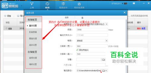 如果你要转码,点击转码 ,添加视频,点击配置,设置你需要转码成怎样的视频,处理视频中不好的部分,如图