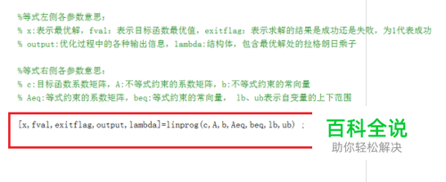 第一步我们首先需要知道,matlab中用于线性规划优化计算的是linprog()函数,公式是[x,fval,exitflag,output,lambda]=linprog(f,A,b,Aeq,beq,lb,ub);,其中各个参数的意思可以看下面的注释,如下图所示: