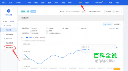 打开生意参谋,改版后原“市场行情”显示的是“市场”,点击“市场”进入,可以看到左边最下“搜索词查询”