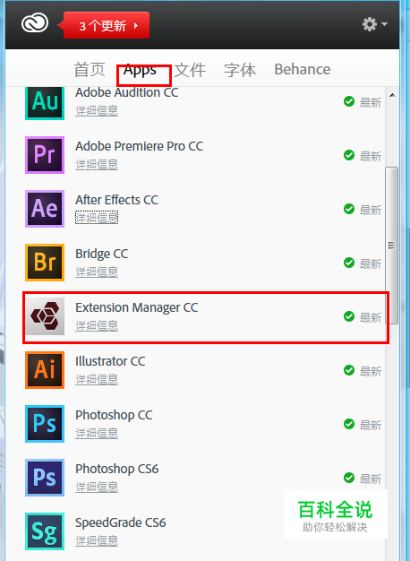 使用Adobe账号登陆Creative Cloud 后,点击顶部菜单栏的APPs,选择Adobe Extension Manager CC,点击安装。