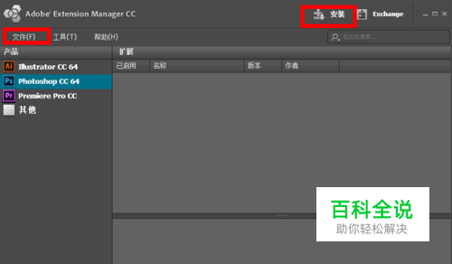 打开Adobe Extension Manager CC,点击文件-安装扩展,或者直接点击右上角“安装”。