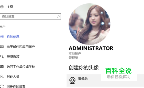 之后我们回到账号选择选项栏第一项“你的信息”点击打开。右侧能看到我们自己的账号。点击下方的“创建头像”上传一个头像(摄像头摄像或者上传一张图片)我们账号就设置好了。
