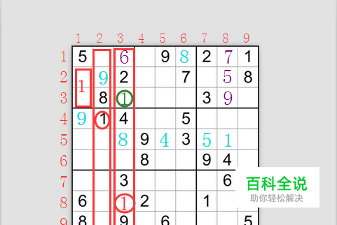 接下来看第一横行第八格, 按照第一横行已有数字1\2\5\8\9, 第八竖行已有数字1\4\6, 第三宫 已有数字1\2\3\8, 综合上诉情况只能填7。 这种解法小编叫做 排除法。