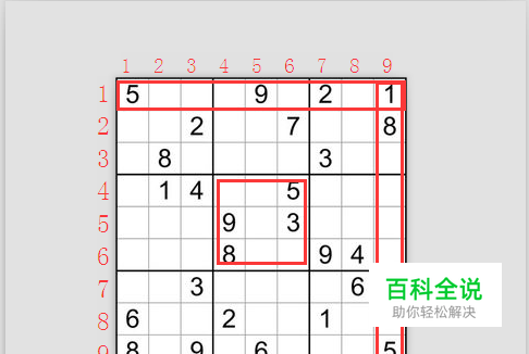九宫格填法要求每个宫的数字都是1-9,数字不能重复,且要保证每一横行或竖行都的数字都是1-9,数字不能重复。下面小编以下图为例为大家讲解填法。