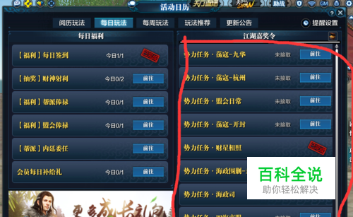 之后,点每日玩法,玩家可以在右半边看到所有的势力任务,需要注意的是,玩家在选择做势力任务之前,应先将鼠标放在即将决定做的势力任务上看看适合的玩家等级,如果不适合,则玩家做了也得不到相应的势力奖励
