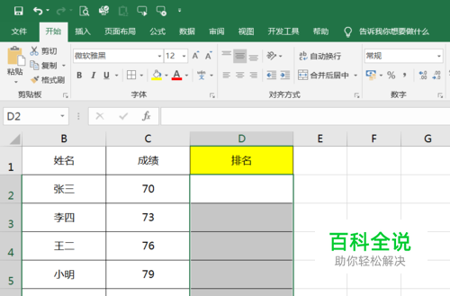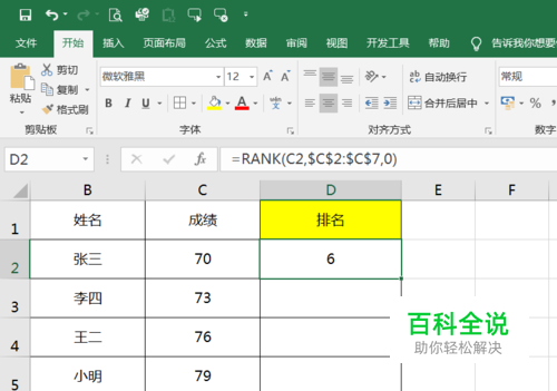在D2单元格输入“=RANK(C2,$C$2:$C$7,0)”。