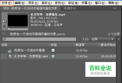 制作好的字幕就在项目面板上面了,用鼠标把字幕拖拽到视频2轨道上,并放在合适的位置,按空格键浏览一下字幕滚动的速度,如果觉得速度太快了,那么可以把鼠标移动到字幕的后面,往右拖动,字幕条就会变长,也就是时间变长,那么字幕滚动的速度就变慢了,只要合适就行,或者是选中字幕,右键选择速度/持续时间,再输入需要的时间长度。